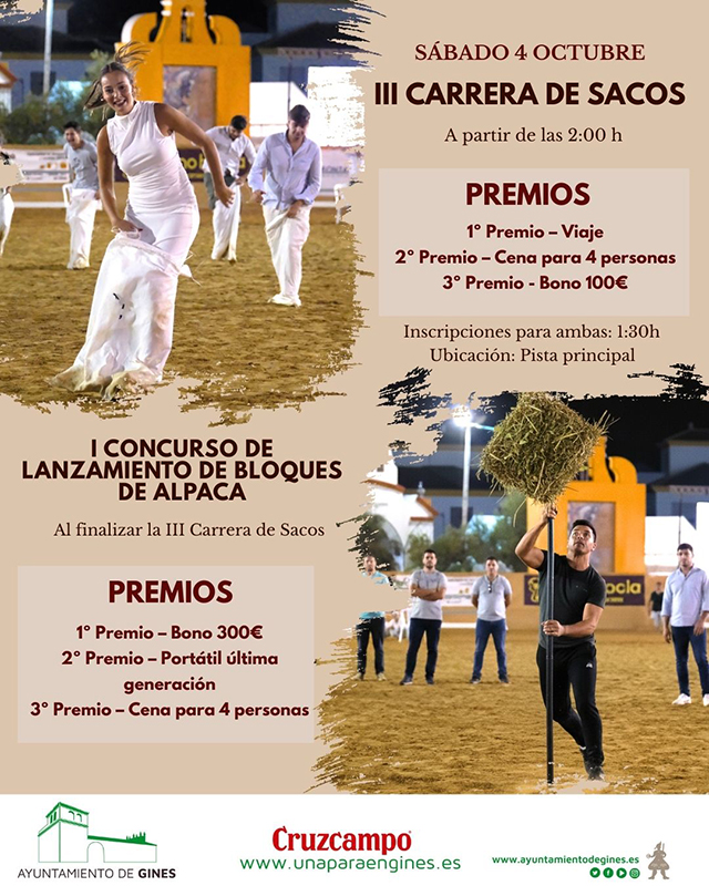 La XVII edición de Una Pará en Gines, que se celebrará del 2 al 5 de octubre, incluirá dos competiciones en las que la diversión será la gran protagonista, la ya consolidada III Carrera de Sacos y el estreno del primer concurso de Lanzamiento de Bloques de Alpaca.