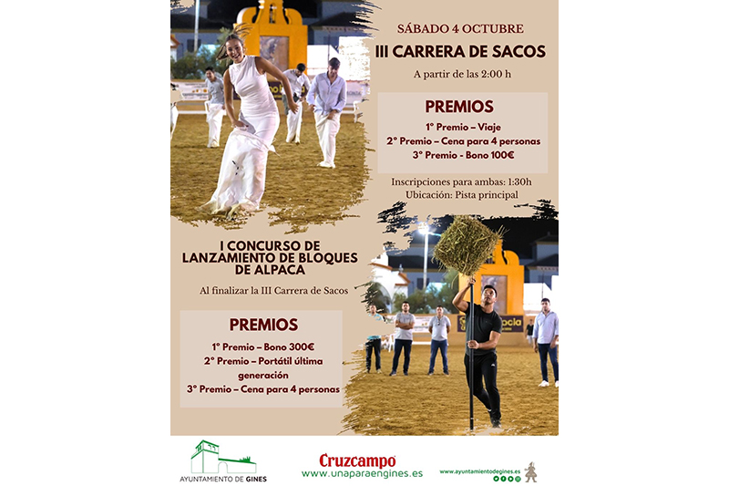La XVII edición de Una Pará en Gines, que se celebrará del 2 al 5 de octubre, incluirá dos competiciones en las que la diversión será la gran protagonista, la ya consolidada III Carrera de Sacos y el estreno del primer concurso de Lanzamiento de Bloques de Alpaca.