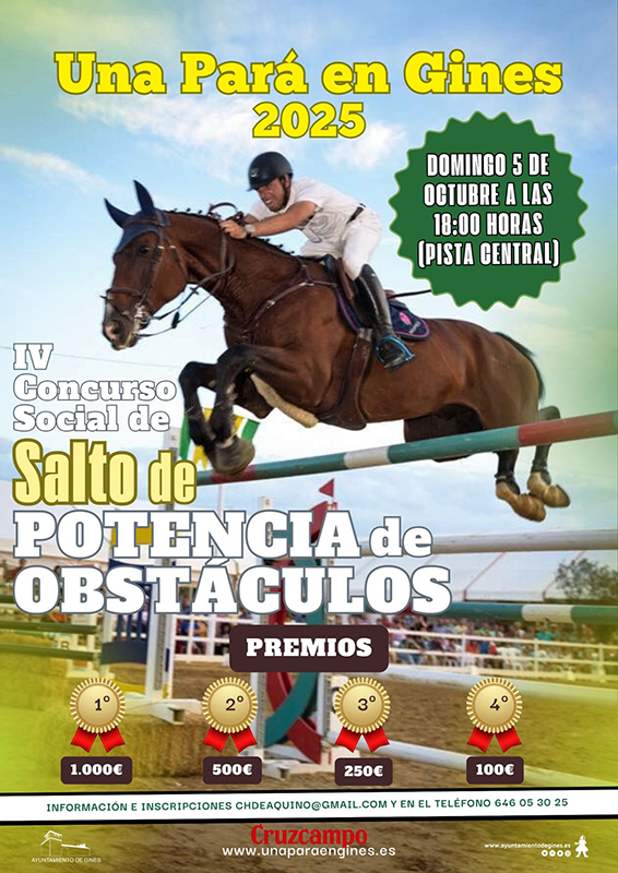 La espectacularidad y emoción del mundo ecuestre volverán a tener un papel destacado en ‘Una Pará en Gines’ 2025 con la celebración del IV Concurso Social de Salto de Potencia de Obstáculos, que tendrá lugar el domingo 5 de octubre a las 18:00 horas en la pista central del recinto.