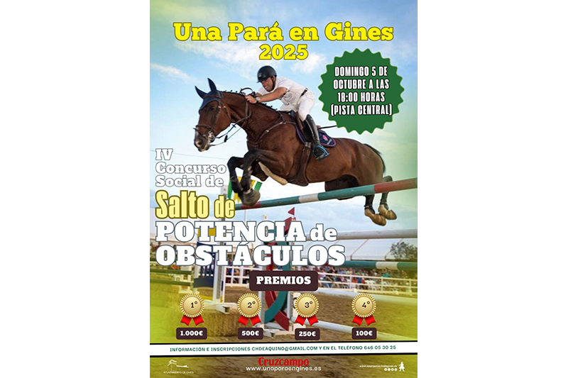 La espectacularidad y emoción del mundo ecuestre volverán a tener un papel destacado en ‘Una Pará en Gines’ 2025 con la celebración del IV Concurso Social de Salto de Potencia de Obstáculos, que tendrá lugar el domingo 5 de octubre a las 18:00 horas en la pista central del recinto.